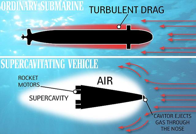 超空泡技术主要在于其形成了巨大的“空泡”,通常情况下船体与水是直接接触的,这样就会带来巨大的航行阻力,为了提升速度,就要避免与水接触,于是就有了地效飞行器、水翼艇、气垫艇等,脱离水面后可以大大降低阻力,至少空气阻力要远小于劈波斩浪带来的阻力。超空泡技术虽然也是避开水的阻力,但不是脱离水面,而是在航行器与水之间形成空气隔层,这样阻力就被转化为空气与水的作用,空气泡推开水时的阻力就明显小于金属与水的阻力,目前的超空泡鱼雷速度可以达到200节,是最快的海中武器,在20公里内击中目标只是转瞬之间。