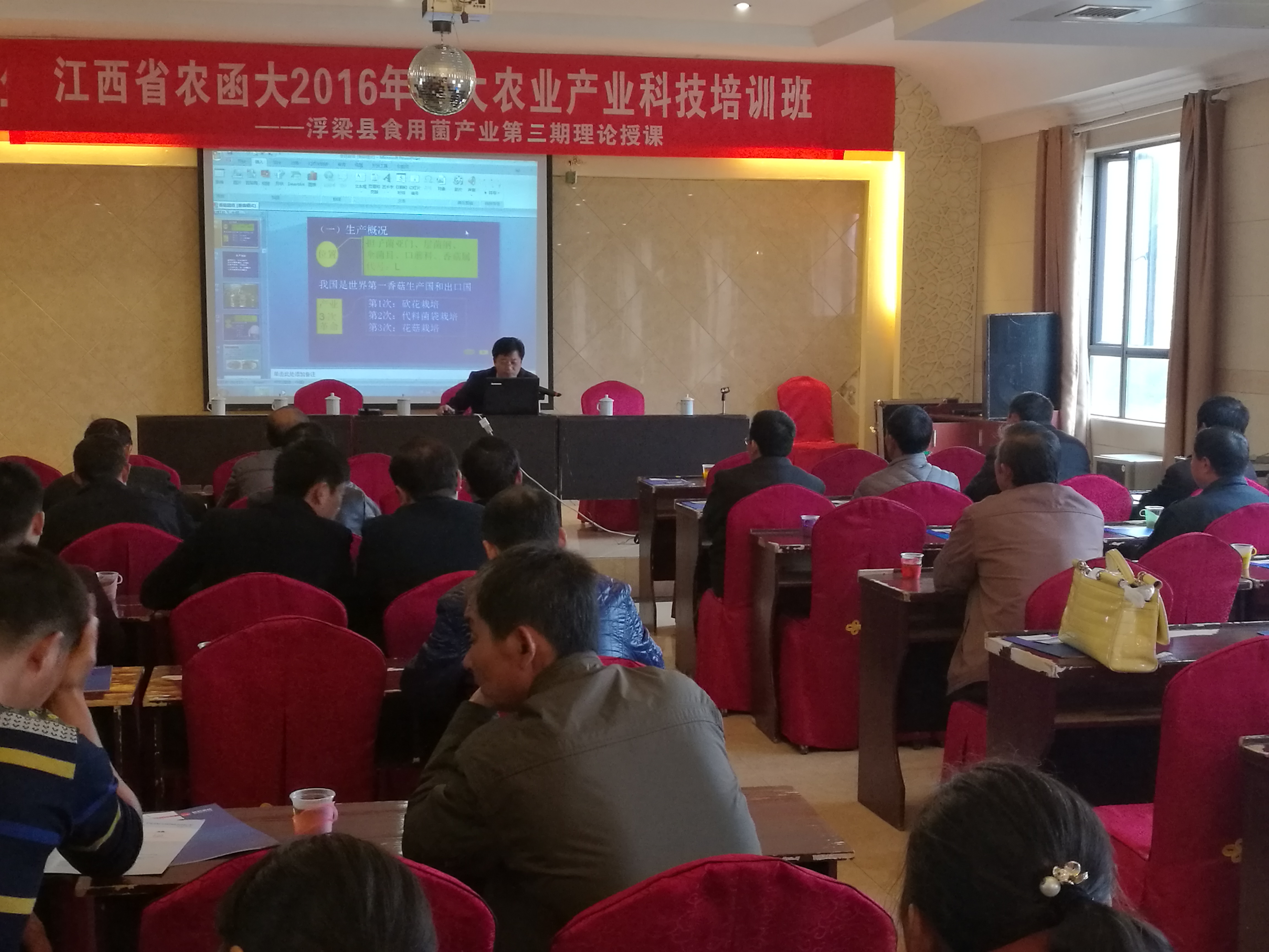 11月17日,江西省农函大2016年十大农业产业科技培训——浮梁县食用菌产业化班第三期培训班开班,在浮梁镇红塔大酒店会议室举办。省农函大产业化班指导员周泓、吴伟、县科协主席何俊、副主席黄永平和各个乡镇的农户共计80余人参加了此次的集中培训。本次培训由县经济作物局副局长、农艺师戴益清为学员授课。